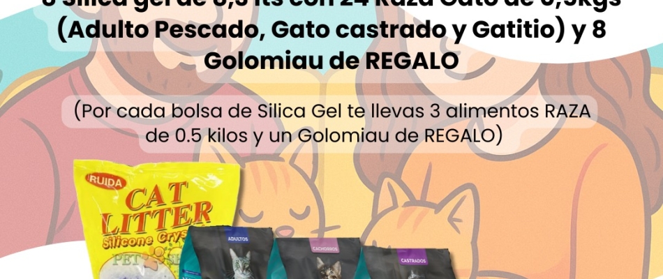 Silica Gel de 8,3 lts con 3 alimentos raza gato de 500 grs y GOLOMIAU de regalo!!!